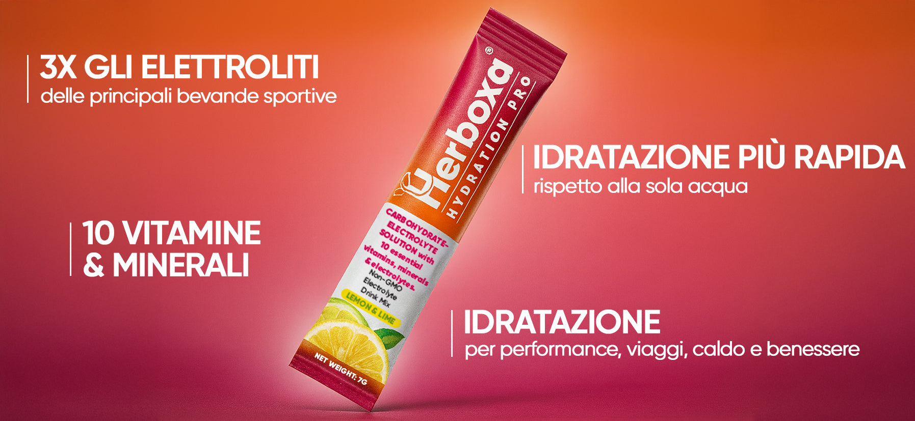 Herboxa® Hydration Pro offre una miscela bilanciata di elettroliti e carboidrati a rapido assorbimento che aiuta il corpo a idratarsi in modo più efficace rispetto alla sola acqua.